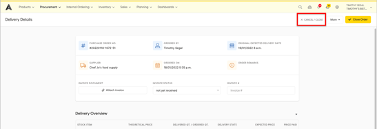 - Une fois que vous avez fermé la commande, elle aura le statut "Fermé". Rappelez-vous, une fois que la commande est fermée, vous ne pouvez plus y ajouter de livraisons.
