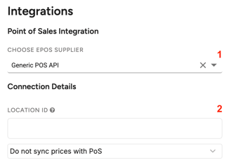 - Once this is confirmed, following the instructions in the PoS Integrations article, you should navigate to the Integrations Tab in your outlet settings, select ‘Generic PoS’ (1) and add the location ID provided by 3S POS (2).