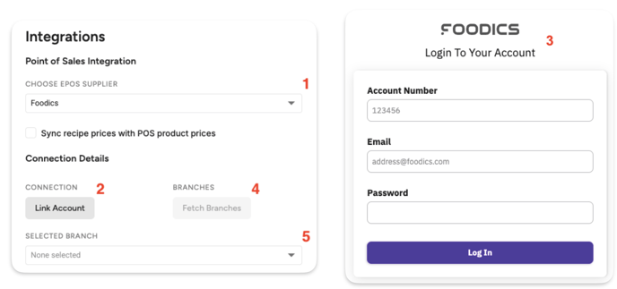 To begin, look for Foodics in the list of PoS suppliers (1), then click on Link Account (2). This will open a new tab in your browser where you can log in to your Foodics account (3). Once logged in, return to Apicbase and click on Fetch Branches (4), then select the corresponding Branch to this outlet (5). With this, you are all set, but don't forget to click Save in the top right corner of the screen!