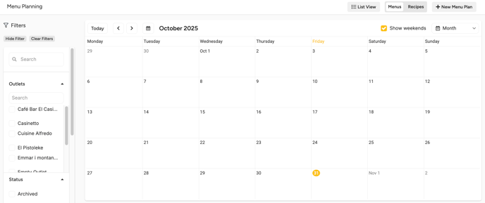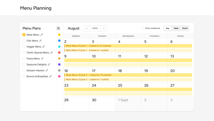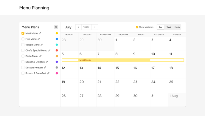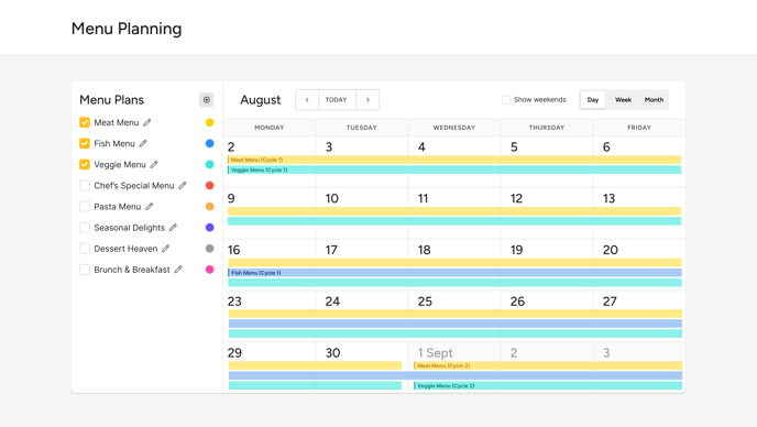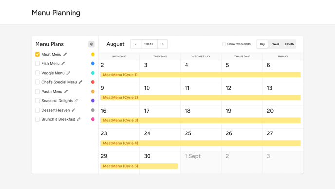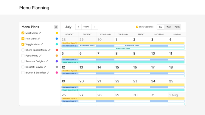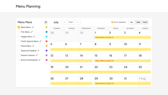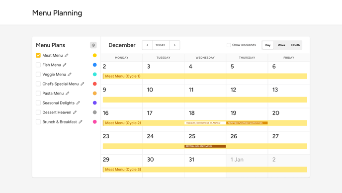 - Calendar View: The Calendar View provides a visual representation of your menu cycles over time. It allows you to see planned menus for specific dates, to quickly identify gaps or overlaps in your menu planning and to easily make adjustments by dragging and dropping menu items