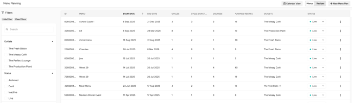 - List View: The List View offers a more detailed, tabular representation of your menu plans. It enables you to view all planned recipes and quantities in a compact format, to perform bulk edits on multiple menu items and to quickly filter and search for specific menu items or cycles.