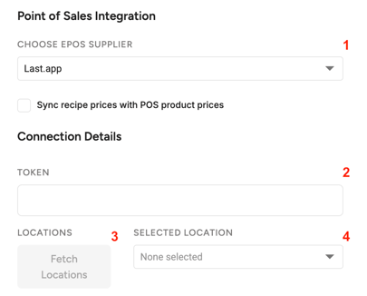 In order to connect Last.app, you will need the Token (2) of your Last.app account. You can request this from your Last.app account manager or to the Last.app support team at hola@last.app. Once you have this information, enter it and click on Fetch Locations (3). Your account's Locations should then be loaded into Apicbase, and you can select the one corresponding to this outlet (4). Don't forget to click Save in the top right corner of the screen!