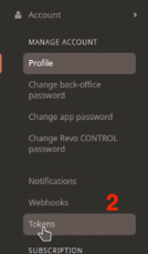 To set up the Revo integration you will need a Username and a Token. You will find there in your Revo account. First, go to your Revo account and, in the side panel, go to Manage Account. There you will find your username (1), in this example the username is "apicbase".
