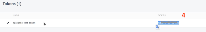 To get the token, you should navigate to the side panel and click tokens (2). There you can create a token with a name you can choose yourself (3), in this example the token was named apicbase_test_token, but you can use any other name.