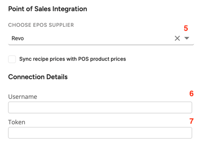 Now, following the instructions in the PoS Integrations article, you should navigate to the Integrations Tab in your outlet settings. Look for Revo in the list of PoS suppliers (5). You can then pastethe Username (6) and Token (7) in their corresponding fields. Don't forget to click Save before leaving the page!