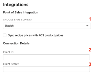 In order to connect Sitedish, you will need the Client ID (2) and Client Secret (3) of your Sitedish account. You can request this from your Sitedish account manager. Don't forget to click Save in the top right corner of the screen!
