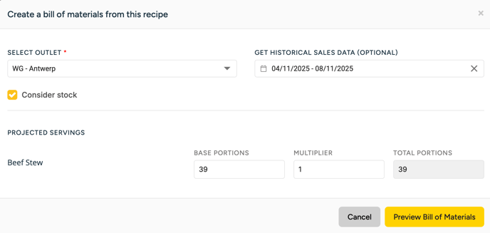 When generating a BoM for recipes or menus when a PoS is connected, you can also import historical sales data to auto-populate the required portions.