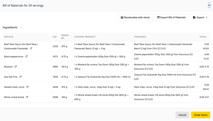 Regardless of where you generate a BoM (Recipe, Menu, Production Plan, or Internal Orders), the process follows the same steps.