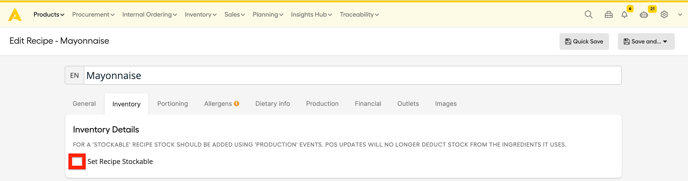 If the recipe is not set as a stockable recipe, then every time I sell a portion of “French Fries + Mayonnaise,” a fraction of the ingredients used to make the mayonnaise will be deducted from stock.